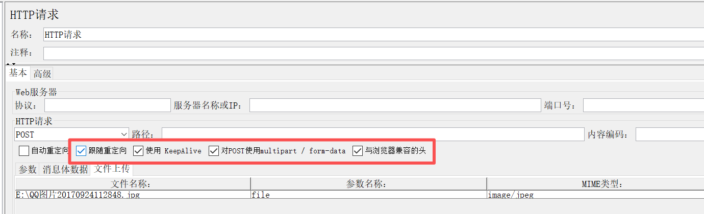 红框的地方直接全勾上,上传文件的请求头是Content-Type=multipart/form-data,而且这个不能像常规那样,写在http信息头管理器里面,必须勾选这里的。