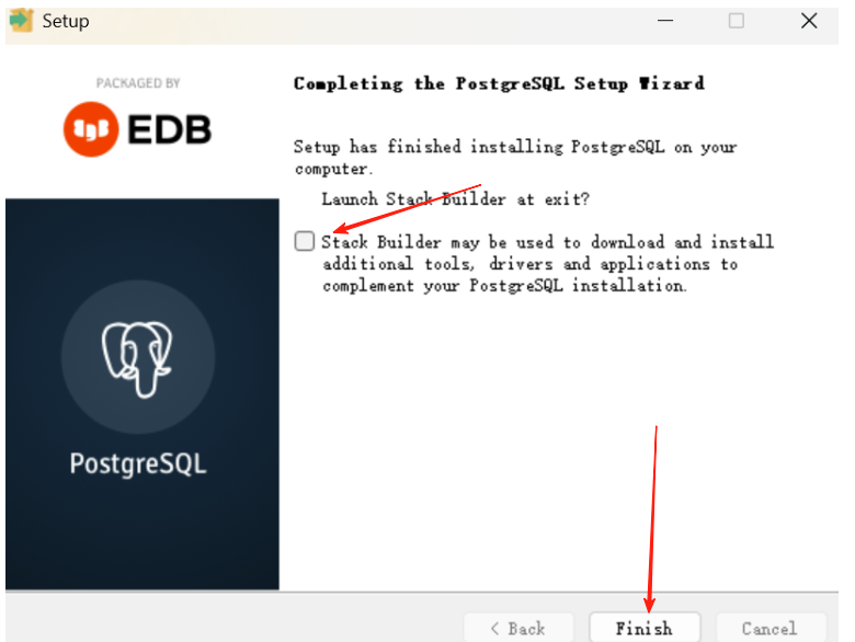 取消勾选Stack Builder,然后点击Finish关闭窗口。