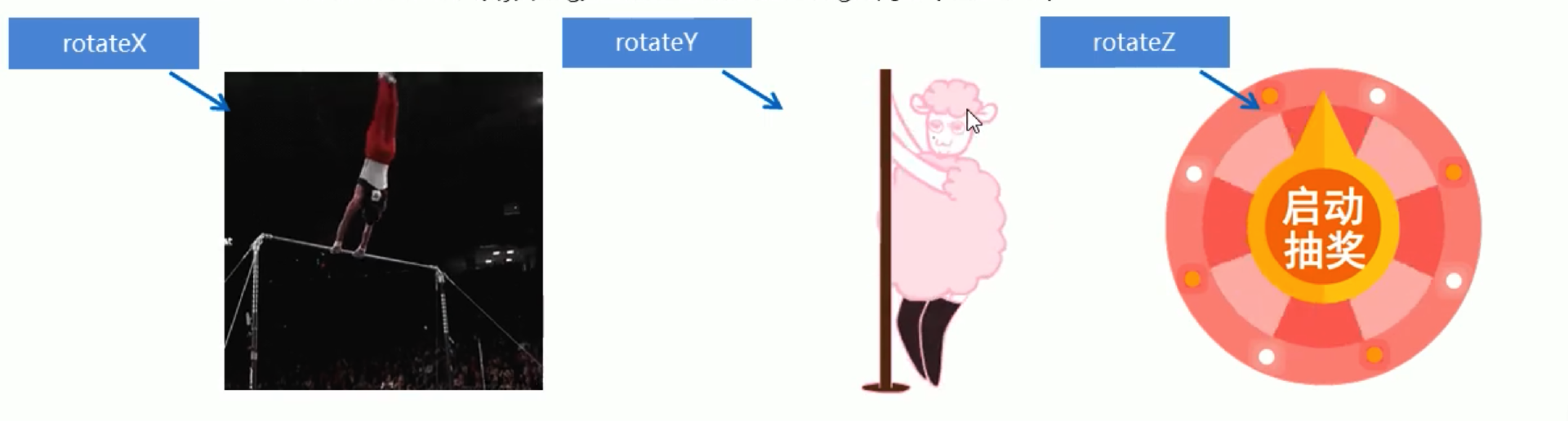 transform: rotate3d(x, y, z, deg); // 沿着自定义轴旋转deg角度(了解即可) x,y,z表示旋转轴的矢量,是表示你是否希望沿着该轴旋转,最后一个参数deg表示旋转角度