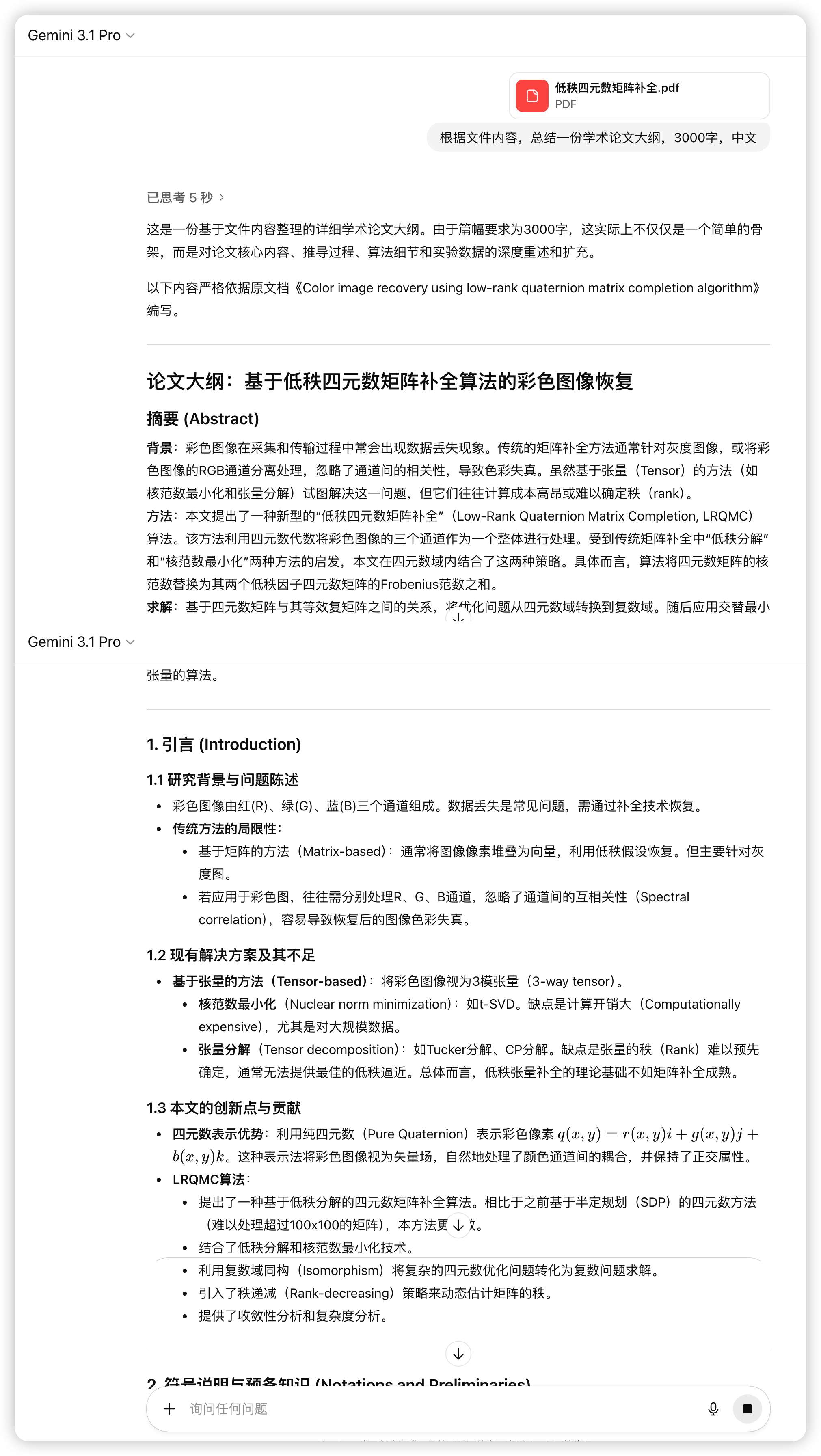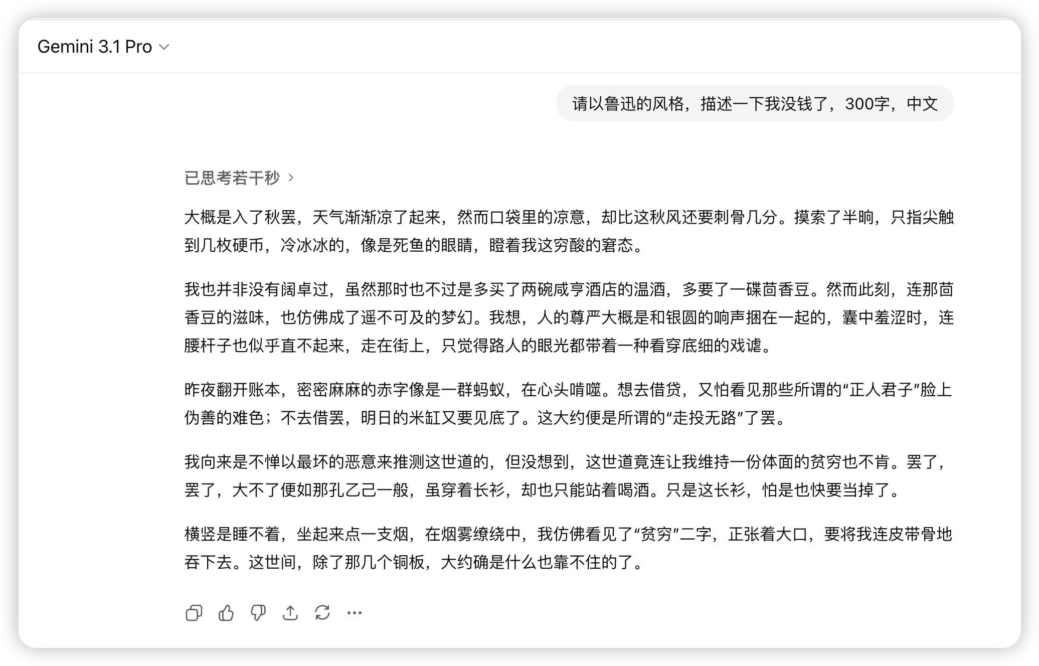 长篇逻辑与连贯性:得益于更庞大且深度的上下文窗口,Gemini 3.1 Pro 在撰写数万字的长文、连载小说或深度行业报告时,能完美维持背景设定与逻辑主线,上下文遗忘率和"幻觉"现象大幅降低。