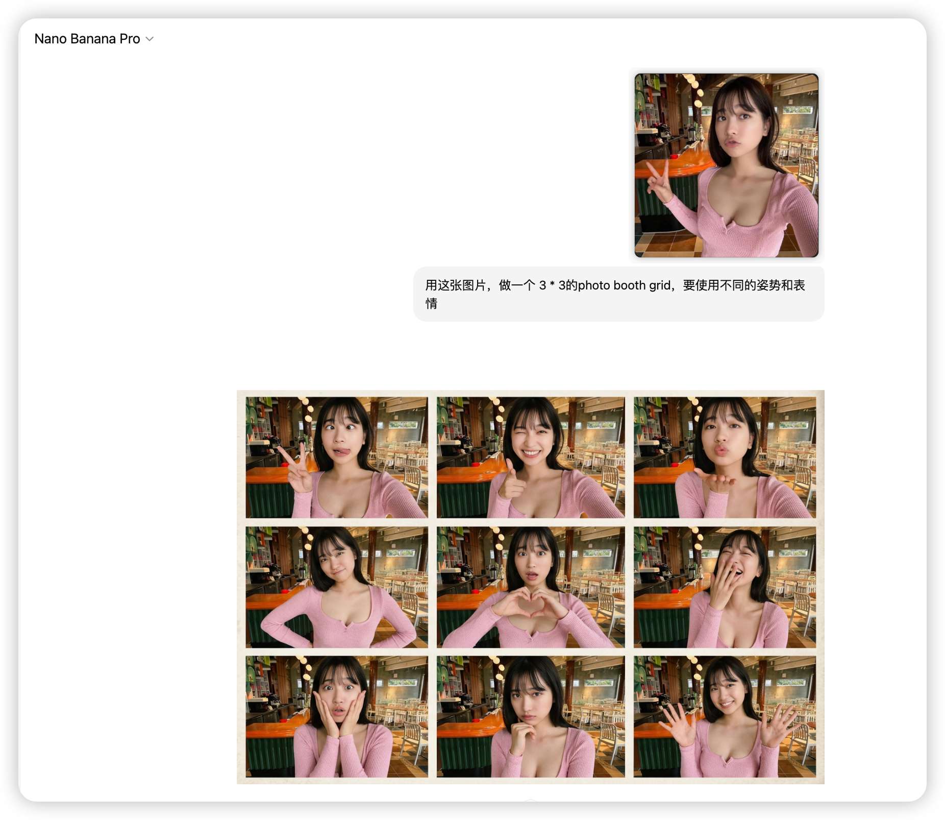提示词:用这张图片,做一个 3 * 3的photo booth grid,要使用不同的姿势和表情