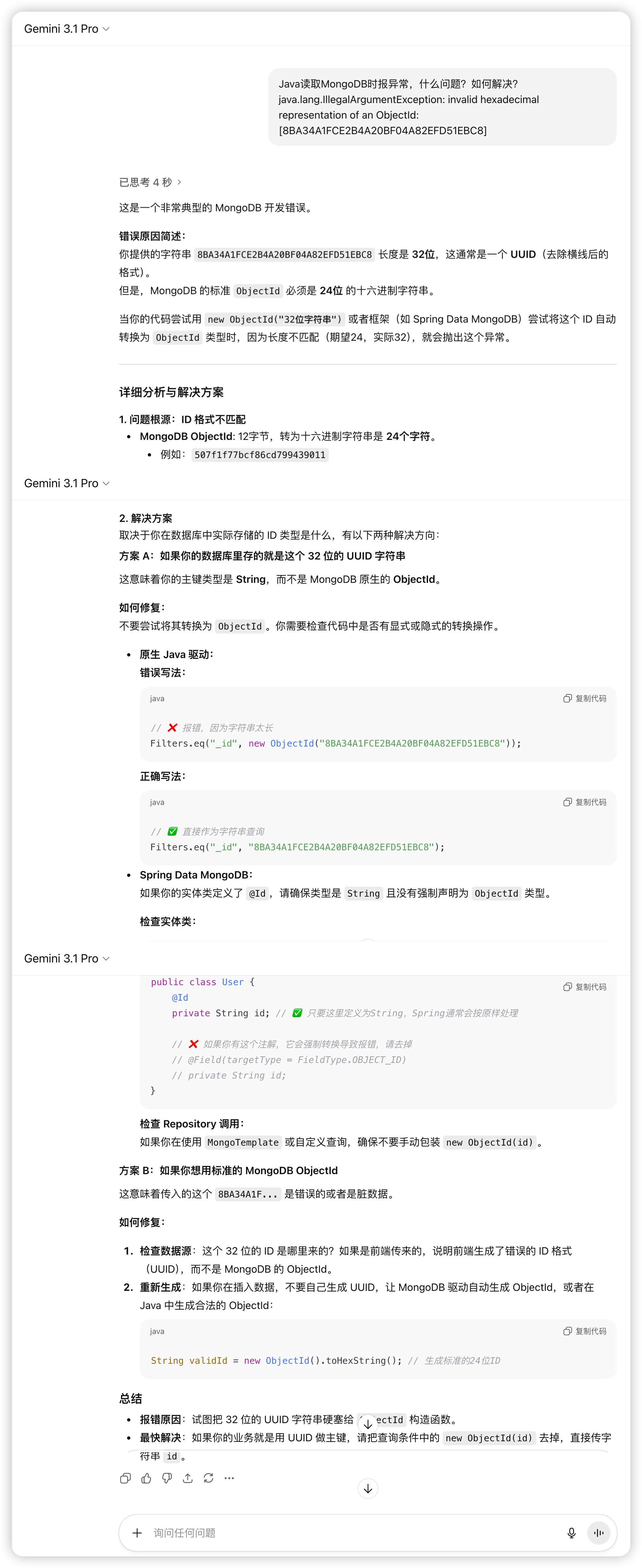 提示词:Java读取MongoDB时报异常,什么问题?如何解决?java.lang.IllegalArgumentException: invalid hexadecimal representation of an ObjectId: