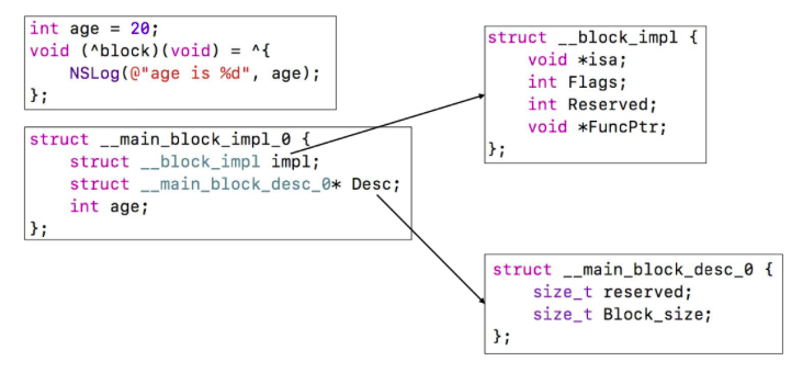 假设一个block中捕获了一个int类型的变量,那么其C语言实现如下: