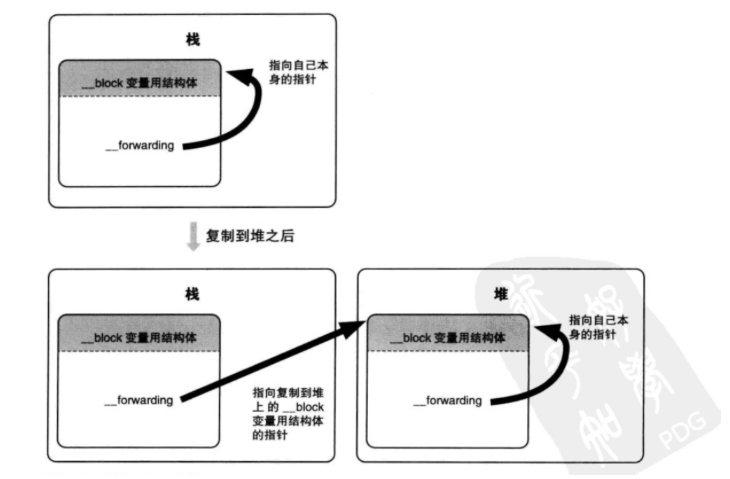 __block变量的访问都通过__forwarding指针,确保访问的是最新最有效的内存区域。