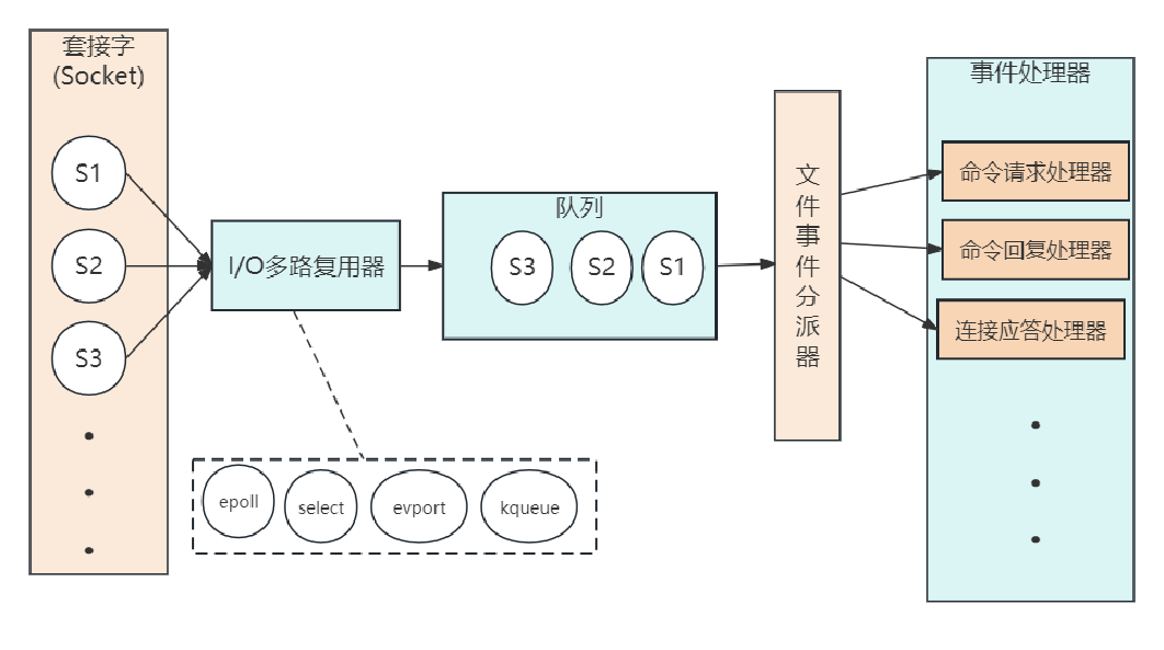 I/O多路复用器负责通过loop循环监听多个套接字,同时将一系列套接字按循序存储到一个队列中,由队列向文件事件分派器传送队列中套接字。这个队列中套接字是有序的,它会当一个套接字事件被处理完毕后,会立马向文件事件分配器传送下一个套接字。