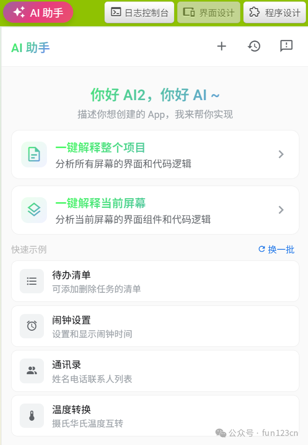 大家好!今天给大家介绍AppInventor2中文网(https://www.fun123.cn)绝对独家最新上线的重磅功能:AI 助手 !
