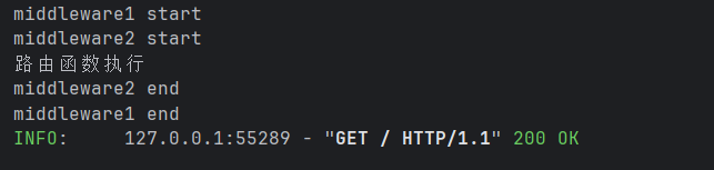 pythonfrom fastapi import FastAPI app = FastAPI() # 定义基础中间件 @app.middleware("http") # async:异步处理,协程 async def global_middleware(request, call_next): # request:请求,cell_next:下一个中间件或路由处理函数 # 请求到达路由前执行:start部分 print(f"中间件开始处理:{request.method} {request.url}") # 传递请求到下一个中间件/路由 response = await call_next(request) # 响应返回客户端前执行:end部分 print(f"中间件处理完成:响应状态码 {response.status_code}") return response @app.get("/") async def root(): return {"message": "Hello FastAPI"}1.3、多个中间件的执行顺序