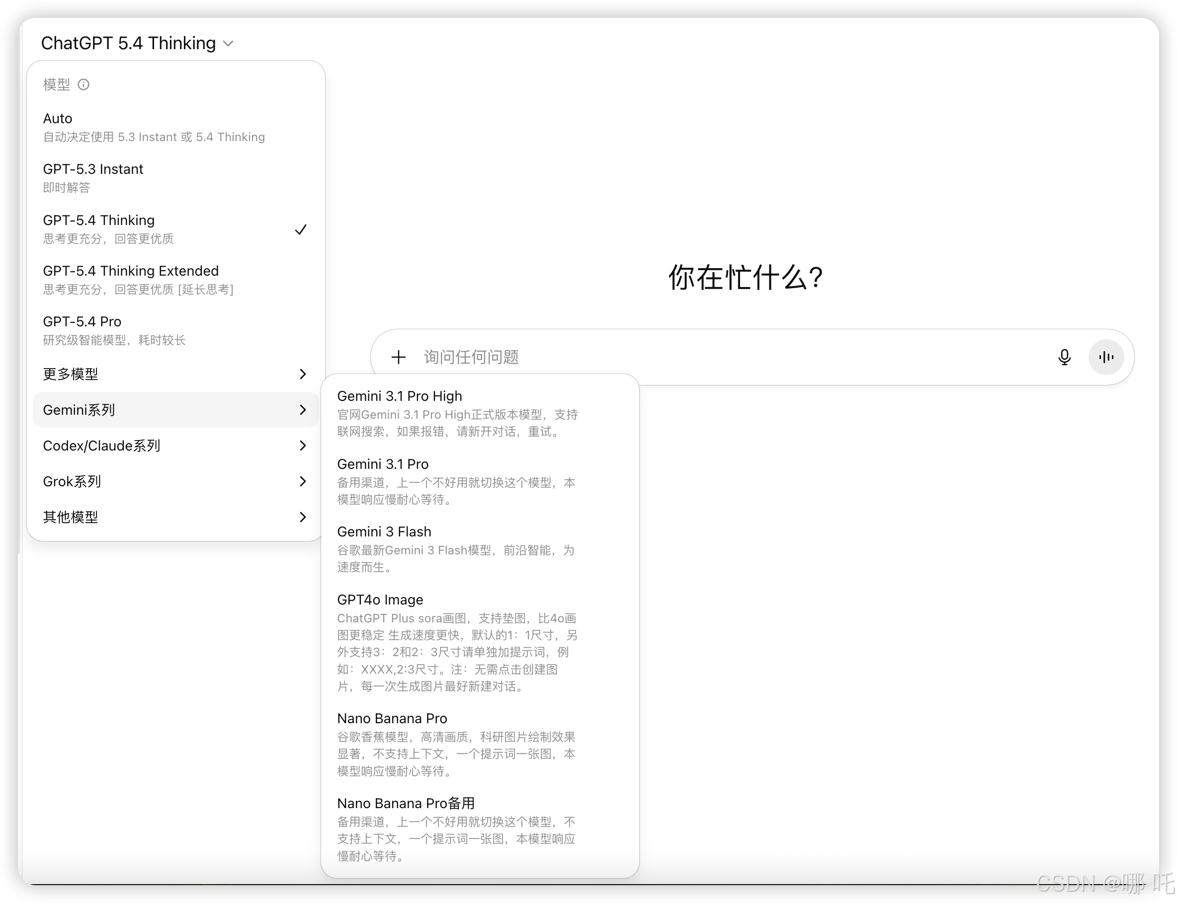 包含GPT 5.3、GPT 5.4 Thinking、GPT 5.4 Pro、Gemini 3.1 Pro、Nano Banana Pro、Claude Sonnet 4.6、Codex、Grok4.2等模型。