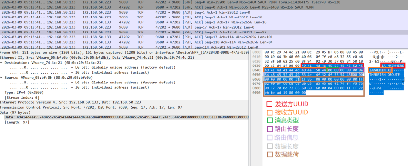| 字段 偏移 长度 说明 ---------------------------------------- Sender 0 10字节 发送方UUID Accepter 10 10字节 接收方UUID MessageType 20 2字节 消息类型(大端序) RouteLen 22 4字节 路由长度(大端序) Route 26 变长 路由信息 DataLen 变长 8字节 数据长度(大端序) |