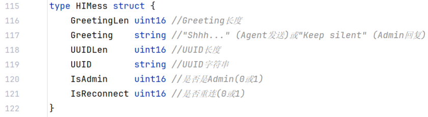 | Agent → Admin: 16字节AuthToken Admin → Agent: 16字节AuthToken回显 Agent → Admin: HI消息(消息类型0) Admin → Agent: HI响应(消息类型0) Admin → Agent: UUID分配(消息类型1) Agent → Admin: MYINFO消息(消息类型4) |