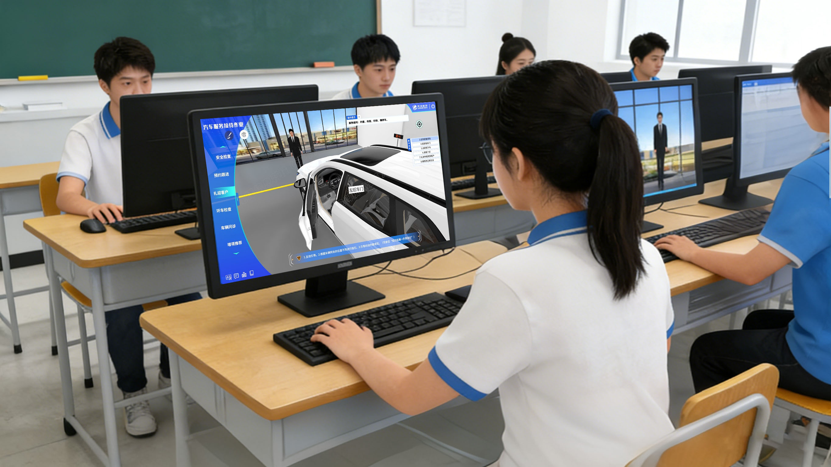 - 1:1 还原 4S 店服务接待场景与设备模型