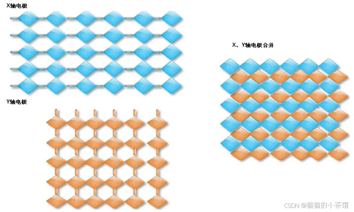 电容触摸屏: 不断扫描x,y轴上小电容的电荷变化,得到x,y坐标。