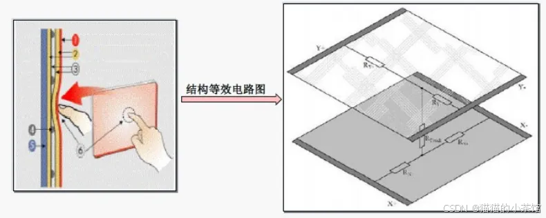 电阻触摸屏: 上下两个面,分别测量对方的电阻,根据电阻计算出坐标。