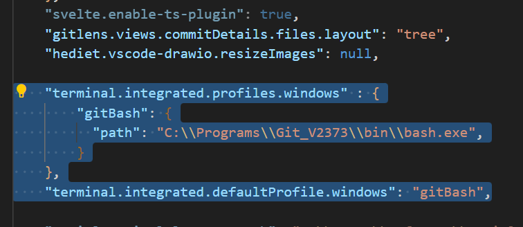 {"terminal.integrated.profiles.windows": {"Git Bash": {"path": "C:\\Program Files\\Git\\bin\\bash.exe","args": [""]}},"terminal.integrated.defaultProfile.windows": "Git Bash"}- 如果 Git 安装在非默认路径,请将