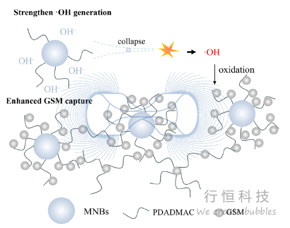 - 自由基氧化 :微纳米气泡溃灭时产生羟基自由基(·OH),可氧化降解GSM。投加自由基淬灭剂(叔丁醇)后,去除率下降,证实了该途径的贡献。PDADMAC改性气泡因其表面富集更多OH⁻,能产生更多·OH(验证实验见原文。