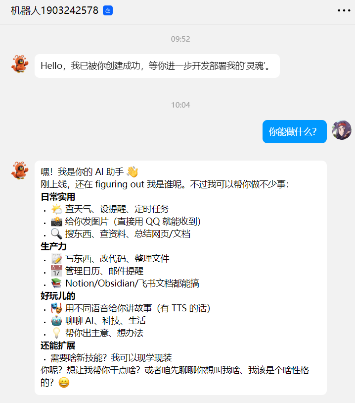 简单而言,就是通过腾讯云与腾讯生态,在相关应用【钉钉、QQ、企业微信等】内部直接实现一个云端部署好的个人聊天机器人。