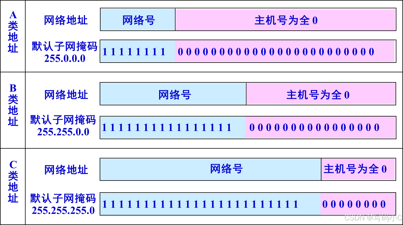 如果一个网络未进行子网划分(即保持两级 IP 地址结构),则使用默认子网掩码 。默认子网掩码中的 1 完全对应于各类地址默认的网络号长度: