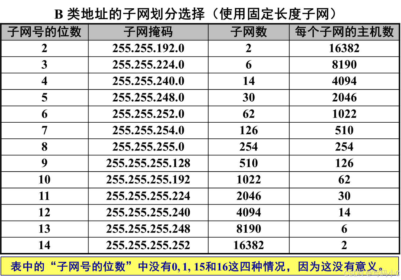 以 B 类地址的固定长度子网划分为例,借用不同位数的主机号作为子网号,会产生不同的子网掩码、子网数量以及每个子网支持的最大主机数。需要注意,子网号位数为 0、1、15 和 16 的情况在实际工程中没有意义。