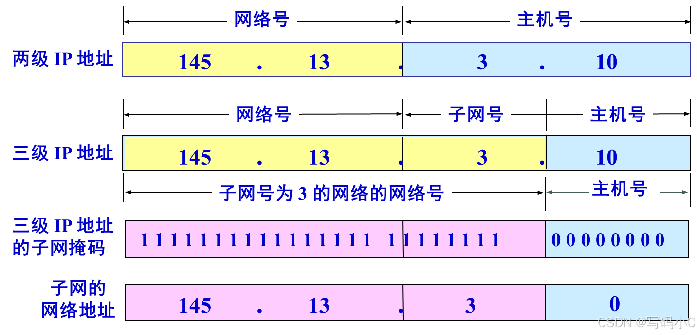 在三级 IP 地址结构中,子网掩码表现为一连串连续的 1 紧接着一连串连续的 0。通过将两级 IP 地址与三级 IP 地址的掩码进行对比,可以直观地看出子网号所占用的比特位。