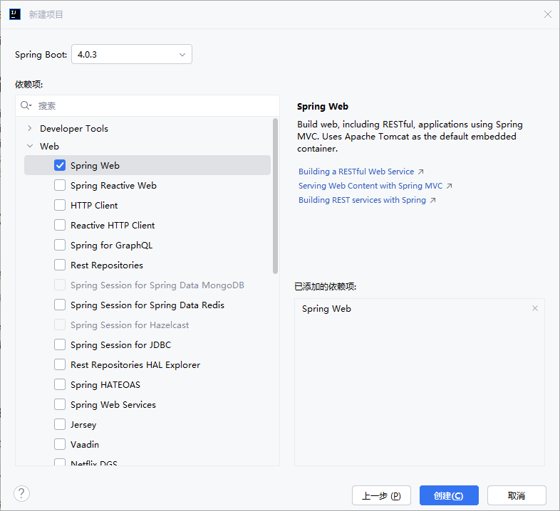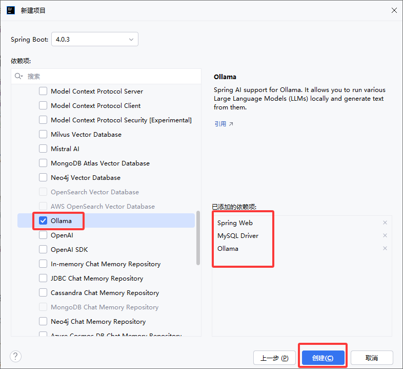 点击【下一步】,选择项目依赖项,按下面截图操作,添加Spring Web、MySQL Driver、Ollama后点击【创建】