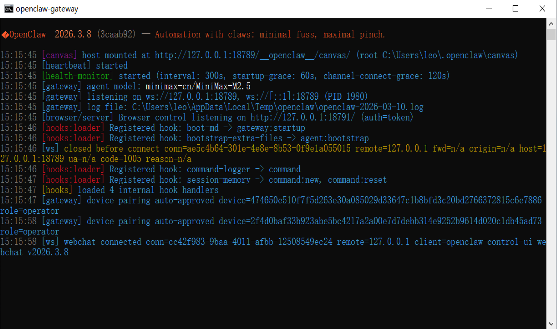 如果你重启了电脑,OpenClaw 网关服务通常会通过 Windows 计划任务自动运行。如果需要手动启动: