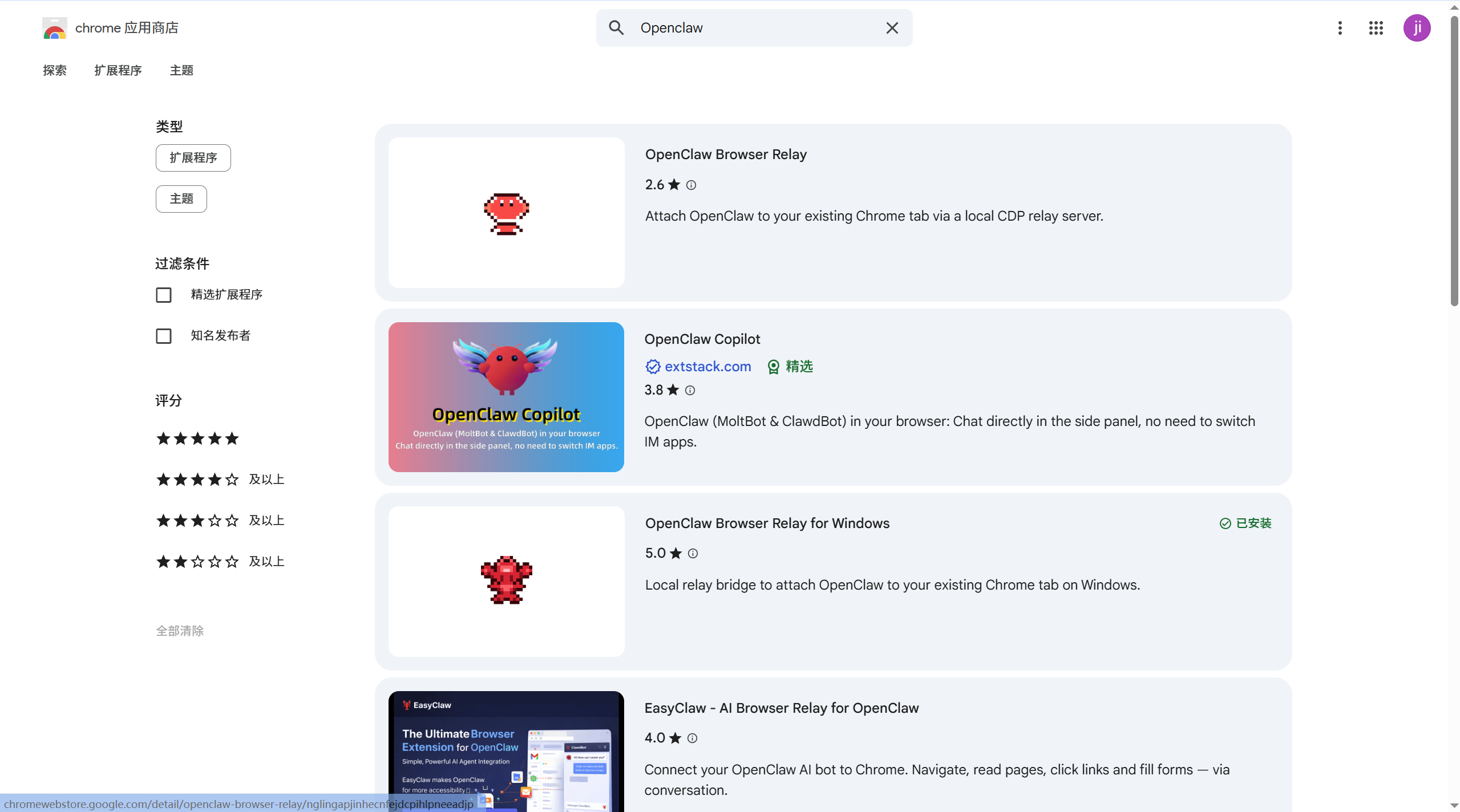 访问 Chrome 应用商店 - OpenClaw 搜索页面,在搜索结果中找到并点击安装 OpenClaw Browser Relay for Windows。