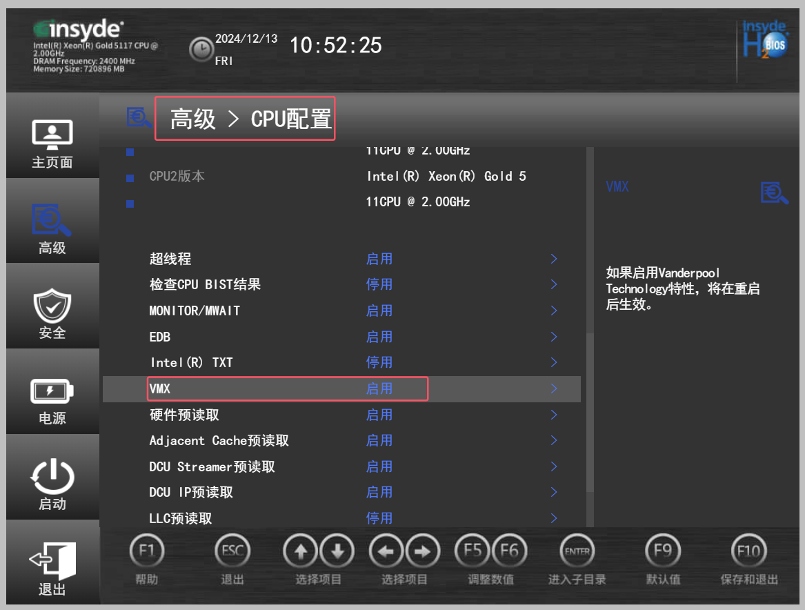 开启硬件辅助虚拟化功能-高级>槽位配置 >CPU配置>VMX