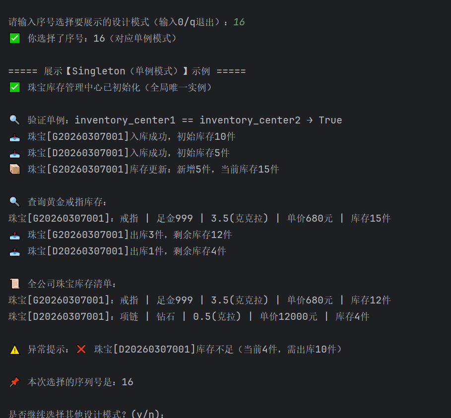 在珠宝行业中,有很多天然适合单例模式的场景:比如「珠宝库存管理中心」(全公司只有一个库存总仓)、「珠宝鉴定证书生成器」(全系统只有一个证书编号生成器)、「会员积分结算中心」等。这些场景的核心特征是:全局唯一、集中管控、数据一致。