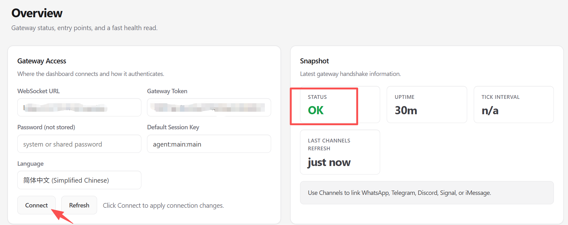 在Gateway Token 输入框中粘贴刚才记录的 Token,点击"连接"(Connect)。