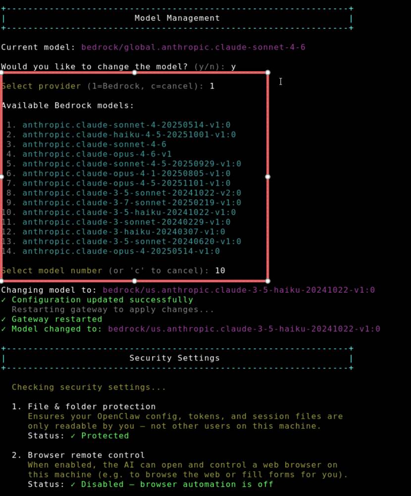 根据提示输入 y 进入模型管理,选择对应的 Provider(如 Bedrock)和模型编号进行更新。
