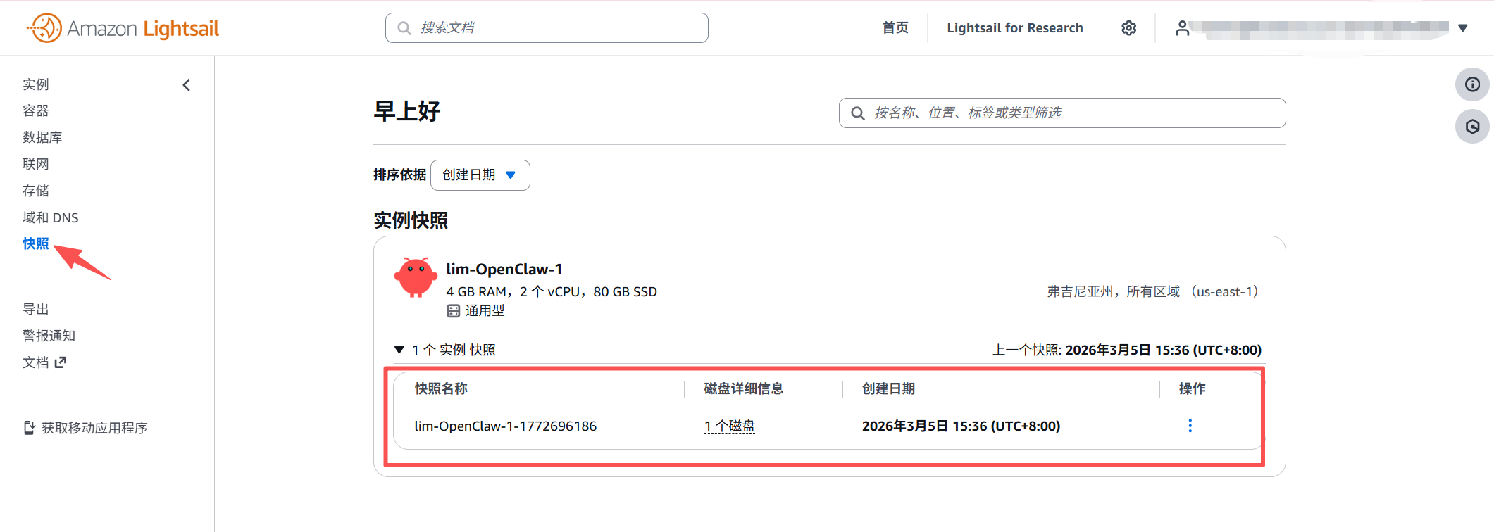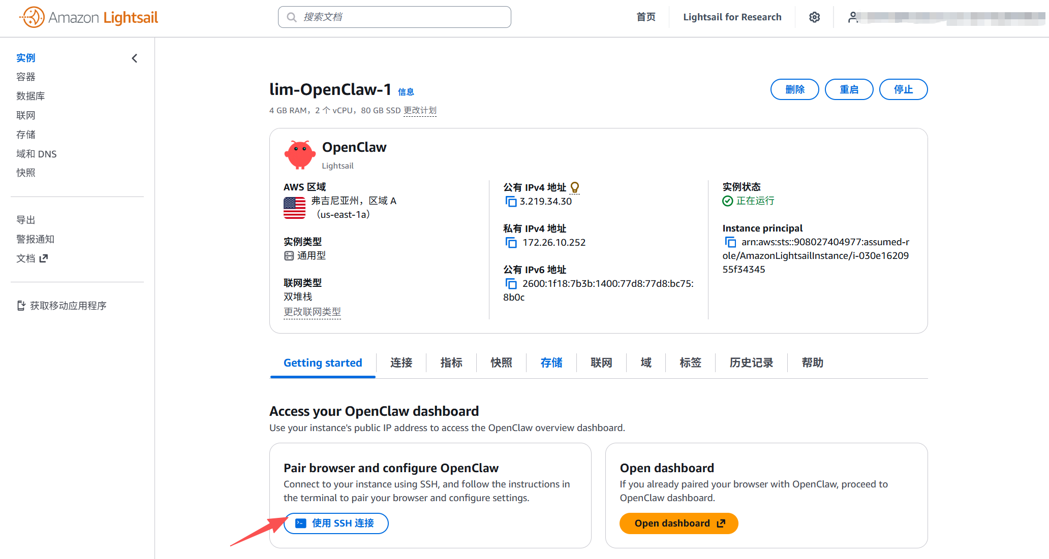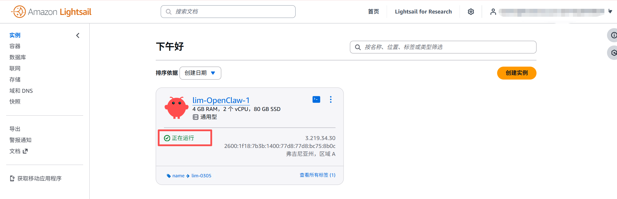 1.在Amazon Lightsail控制台的"实例"页面,选择您的OpenClaw实例。