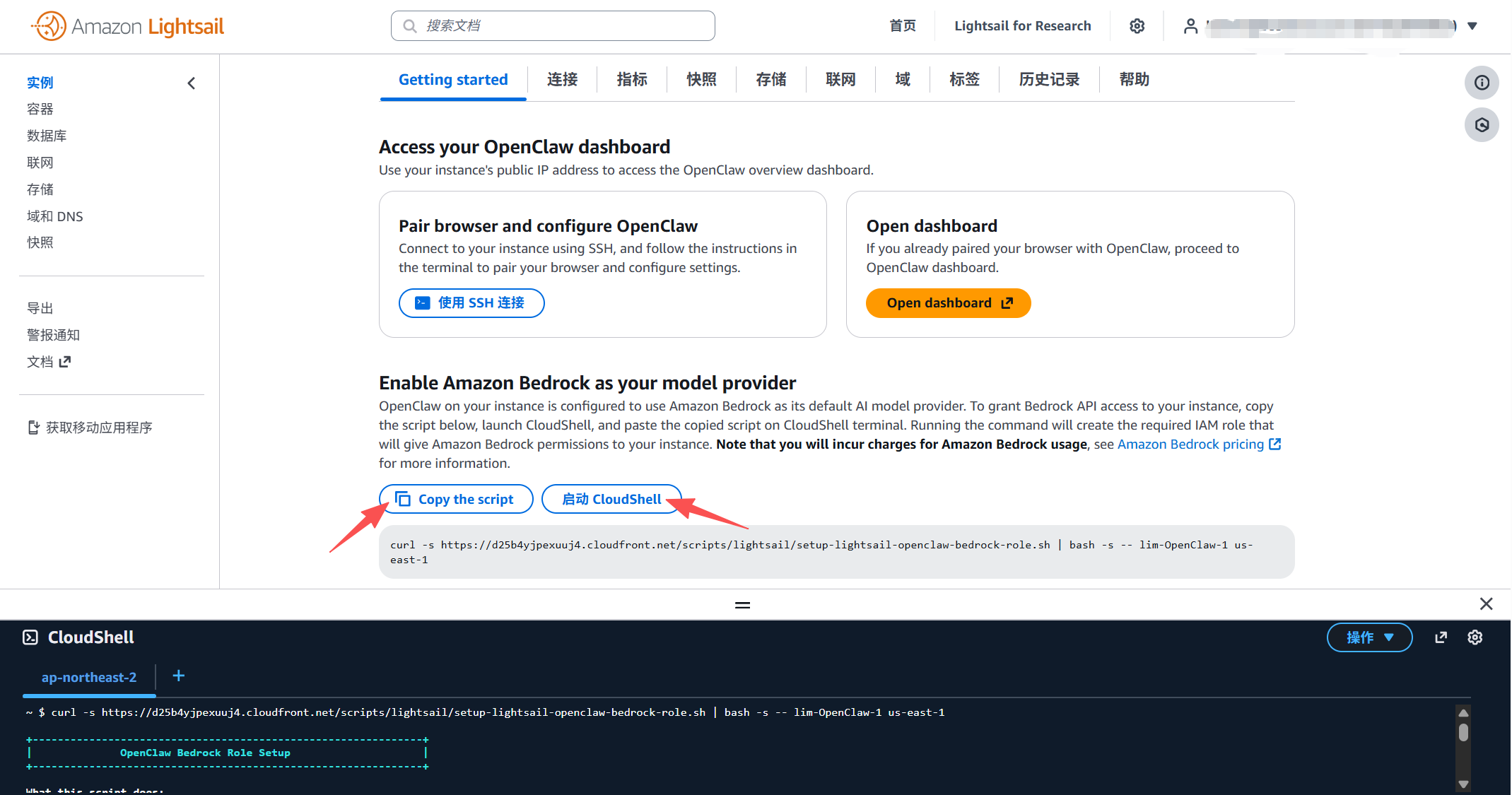 在 Lightsail 实例的管理页面,找到 "Enable Amazon Bedrock" 部分,点击"启动 CloudShell" ,点击 "Copy the script " 复制 CLI 命令。点击 "启动 CloudShell",将命令粘贴进去并回车运行。