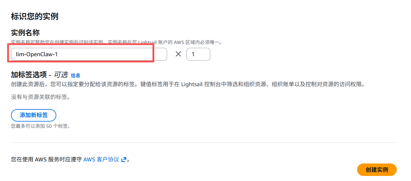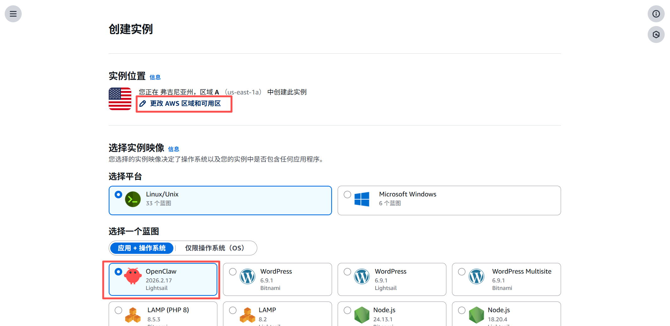1)aws console导航到lightsail服务,创建实例,选择openclaw