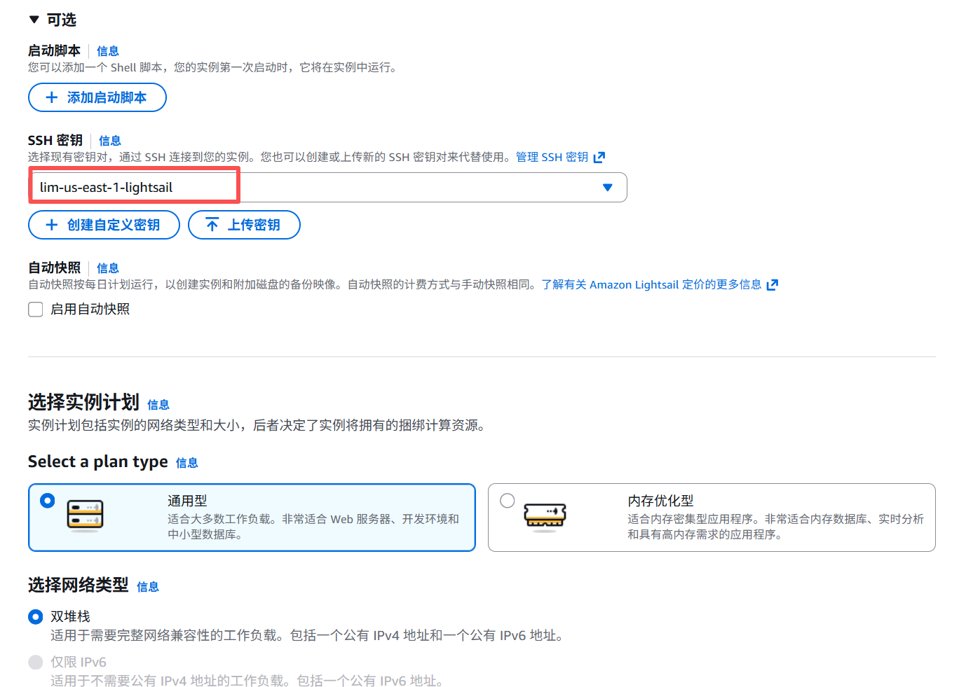 SSH 密钥:选择现有密钥对或创建新密钥。