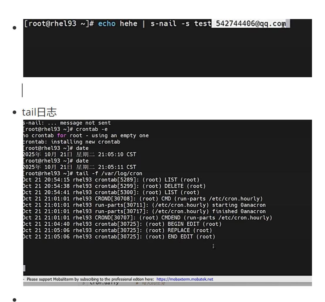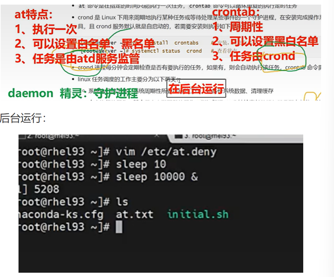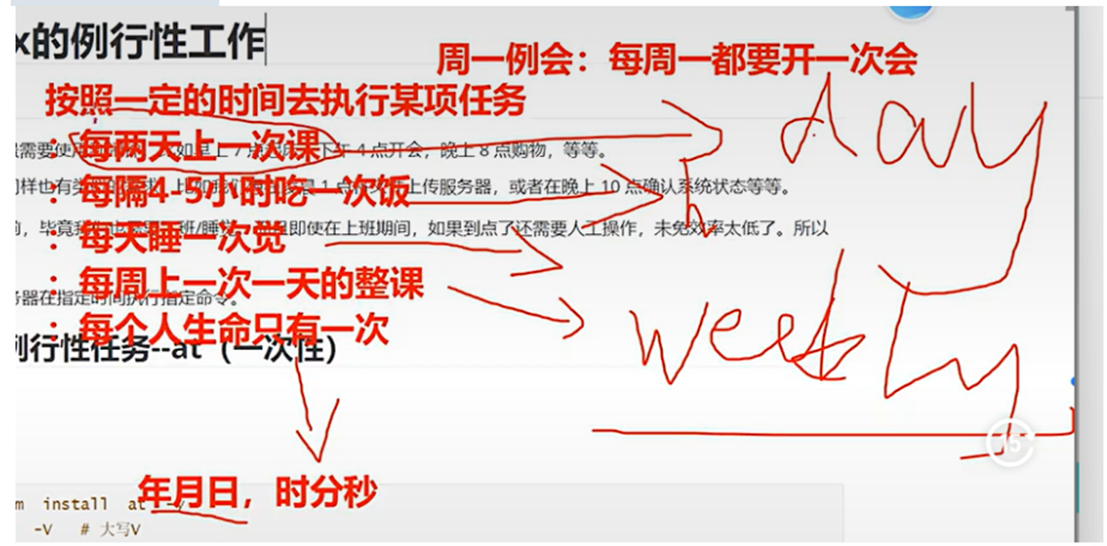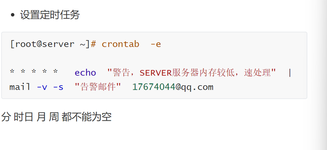 root@rhel93\~\]#vim /etc/s-nail.rc  ###### 最后一行按 O 进入插入模式  # 修改如下文件中的内容为你的邮件账号 运行   ・设置定时任务  ##### 书写定时任务的注意事项 6 个字段都不能为空,如果不确定则使用 \* 表示任意时间 crontab 命令任务的最小时间单位为分钟,最大有效时间为月,如:2024 年某时执行、3 点 30 分 30 秒这样的时间日期无法被识别 定义时间时,日期和星期最好不要一起出现,由于都是以天为单位,非常让管理员混淆 在定时任务中,不管是写命令还是在脚本中写命令,最好都用绝对路径,相对路径有时会报错 #### 1.3.4 系统级别的计划任务 crond 服务除了会在工作时查看 /var/spool/cron 文件夹下的定时任务文件以外,还会查看 /etc/cron.d 目录中的任务。在 /etc/anacrontab 文件里面定义了每天、每周、每月需要执行 的系统任务。 运行 ```bash [root@server ~] # ls -l /etc/ | grep cron* cron.d # 系统定时任务 cron.daily # 每天的任务 cron.deny # 定时任务黑名单 cron.hourly # 每小时执行的任务 cron.monthly # 每月的定时任务 crontab # 定义任务管理文件 cron.weekly # 每周的定时任务 ``` crontab -e 是每个用户都可以执行的命令,但有时定时任务必须由系统执行,此时就需要编 辑 /etc/crontab 配置文件来实现。 运行 \[root@server \~\]# vim /etc/crontab  仅能通过 root 定义,不可以使用普通账户身份去执行计划任务,在 /etc/crontab 最后一行新增计划 任务即可 ```bash SHELL=/bin/ #指定系统使用哪个命令解释器 PATH=/sbin:/bin:/usr/sbin:/usr/bin #系统执行命令的搜索路径 MAILTO=root # For details see man 4 crontabs # Example of job definition: # .---------------- minute (0 - 59) # | .------------- hour (0 - 23) # | | .---------- day of month (1 - 31) # | | | .------- month (1 - 12) OR jan,feb,mar,apr ... # | | | | .---- day of week (0 - 6) (Sunday=0 or 7) OR sun,mon,tue,wed,thu,fri,sat # | | | | | # * * * * * user-name command to be executed ``` 例 1: 每周二 11 点将时间写入 /t1.txt 文件中 运行 ```bash [root@server ~]# vim /etc/crontab 0 11 * * 2 root date >> /t1.txt ``` 例 2: 每天 6:00 点将日志 /var/log/messages 文件备份到 /backup 目录中,备份后的日志文件名修 改为 logfileYYYY-MM-DD 运行 ```bash [root@server ~]# mkdir /backup # 新建目录 [root@server ~]# vim /etc/crontab # 编辑系统计划任务 0 6 * * * root /bin/cp /var/log/messages /backup/logfile`date +\%Y-\%m-\%d` ``` 注意:可以使用 \* \* \* \* \* 进行测试 反引号 \`\` 表示将引起的内容识别为命令,也可以使用 $() 在 crontab 系统中 % 表示换行,需要增加转义符 \\    ### 1.4 练习 #### 题目: 每分钟执行命令 ```bash crontab -e cmd vim /etc/crontab root cmd ``` 1. 每小时执行 2. 每天凌晨 3 点半和 12 点半执行脚本 3. 每隔 6 小时,相当于 6,12,18,24 点半执行脚本 4. 30 代表半点,8-18/2 表示早上 8 点到下午 18 点之间每隔 2 小时执行脚本 5. 每天晚上 9 点 30 重启 nginx 6. 每月 1 和 10 号凌晨 4 点 45 执行脚本 7. 每周六和周日凌晨 1 点 10 分执行命令 8. 每天 18 点到 23 点之间,且每隔 30 分钟执行一次 9. 每隔一小时执行一次 10. 在 4 月份的周一到周三的上午 11 点执行脚本 11. 每天早上 7 点到上午 11 点且每 2 小时执行一次 12. 每天 6 点执行脚本 13. 每周六凌晨 4 点执行 14. 每周六凌晨 4 点 05 执行 15. 每天 8:40 执行 16. 在每天 10:31 执行 17. 每周一到周五 2:00 执行 18. 每周一到周五 8:00 和 9:00 执行 19. 每天 10:00,16:00 执行 答案: 1. \*/1 \* \* \* \* cmd 2. 0 \* \* \* \* cmd 3. 30 3,12 \* \* \* cmd 4. 30 \*/6 \* \* \* cmd 5. 30 8-18/2 \* \* \* cmd 6. 30 21 \* \* \* /usr/bin/systemctl restart nginx 7. 45 4 1,10 \* \* cmd 8. 10 1 \* \* 6,0 cmd 9. 0,30 18-23 \* \* \* cmd 或 \*/30 18-23 \* \* \* cmd 10. 0 \*/1 \* \* \* cmd 或 0 \* \* \* \* cmd 11. 0 11 \* 4 1-3 cmd 12. 0 7-11/2 \* \* \* cmd 13. 0 6 \* \* \* cmd 14. 0 4 \* \* 6 cmd 15. 5 4 \* \* 6 cmd 16. 40 8 \* \* \* cmd 17. 31 10 \* \* \* cmd 18. 0 2 \* \* 1-5 cmd 19. 0 8,9 \* \* 1-5 cmd 20. 0 10,16 \* \* \* cmd *** ** * ** *** ## 二、小白保姆级解读(0 基础也能秒懂) 很多刚接触 Linux 的小伙伴会问:我想让服务器半夜自己备份数据、凌晨自动更新文件、出问题自动给我发邮件,总不能 24 小时守着电脑吧? 答案就是 Linux 的**例行性工作(定时任务)**!说白了就是给 Linux 系统设「闹钟」,到点就自动干活,核心分两种: * **一次性闹钟**:只在指定时间干一次活(at命令) * **循环闹钟**:每天 / 每周 / 每月重复干活(crontab命令) 下面咱们用生活化的类比,把每个知识点掰碎了讲,避坑指南也给你安排得明明白白! ### 一、先搞懂:Linux 定时任务到底有啥用? 就像咱们生活里的闹钟、外卖预约、每周例会提醒,Linux 的定时任务就是帮你**自动化执行重复 / 指定时间的操作**,不用人工值守。 * 凌晨 1 点没人用服务器的时候,自动备份网站数据 * 每天晚上 10 点,自动检查服务器的运行状态 * 服务器出故障了,自动给你发告警邮件 * 每周一凌晨 6 点,自动重启服务器释放内存 ### 二、一次性定时任务:at 命令(订一次外卖,到点只送一次) at就像你预约一次外卖,只在你指定的时间送一次,送完就结束,不会重复。 #### 1. 先装工具 + 开服务 at不是系统默认自带的,先安装,再启动对应的atd服务(相当于闹钟的后台程序): 运行 ```bash # 安装at命令 yum install at -y # 启动atd服务 systemctl start atd # 设置开机自动启动,重启服务器也不失效 systemctl enable --now atd # 查看服务状态,显示active(running)就是正常 systemctl status atd ``` #### 2. 谁能用 at?黑白名单规则(小区门禁逻辑) 系统会通过两个