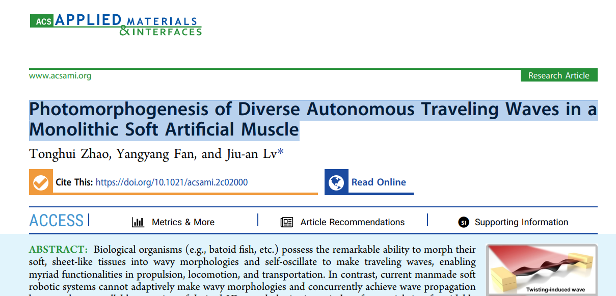 参考文献:Zhao T, Fan Y, Lv J. Photomorphogenesis of Diverse Autonomous Traveling Waves in a Monolithic Soft Artificial Muscle. ACS Appl. Mater. Interfaces, 2022, DOI: 10.1021/acsami.2c02000.