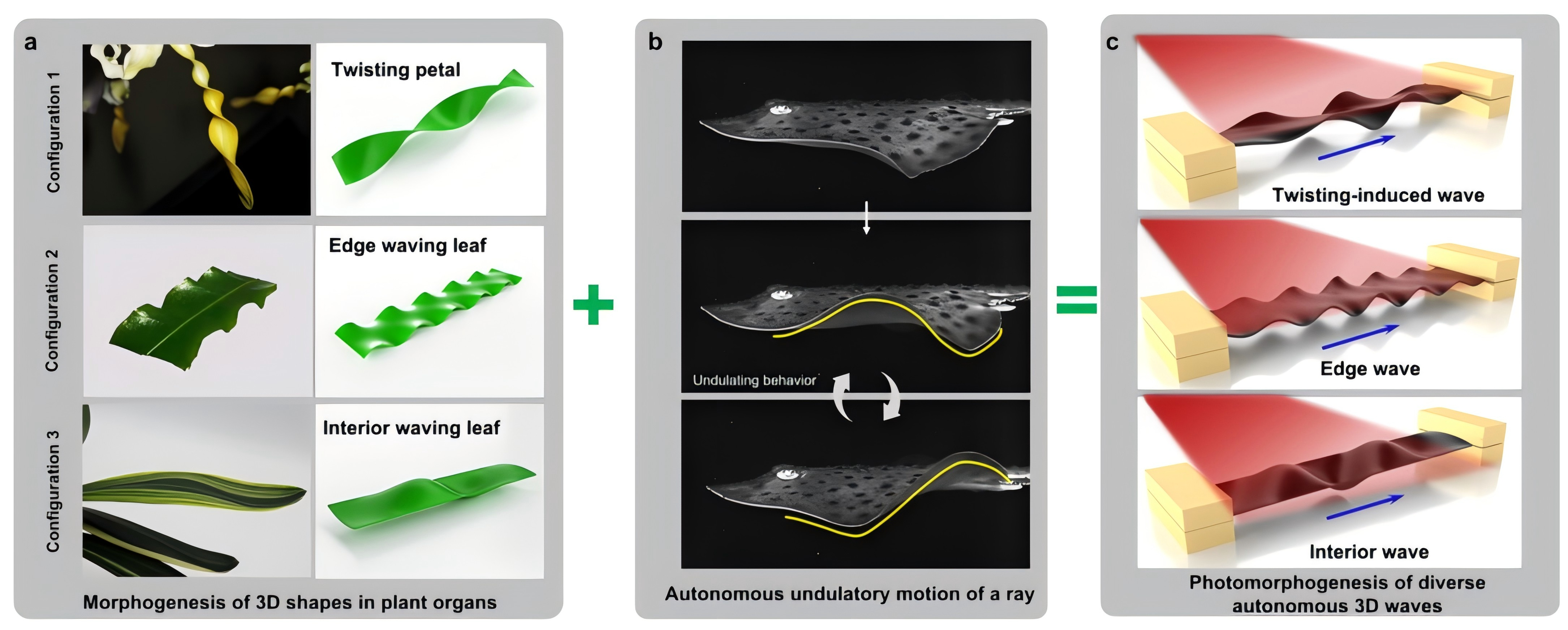 ACS Applied Materials & Interfaces发表了一项突破性研究(Zhao et al., 2022),报道了一种受植物形态发生与黄貂鱼波动游动启发的光控自适应软体人工肌肉系统(PRTAS)。该系统通过结构化光照调控,实现了单一软体材料(monolithic soft artificial muscle, MSAM)的自发3D波浪形态生成(如扭转波、边缘波、内部波)及自主传播,为柔性驱动、智能运输等应用提供了新范式。