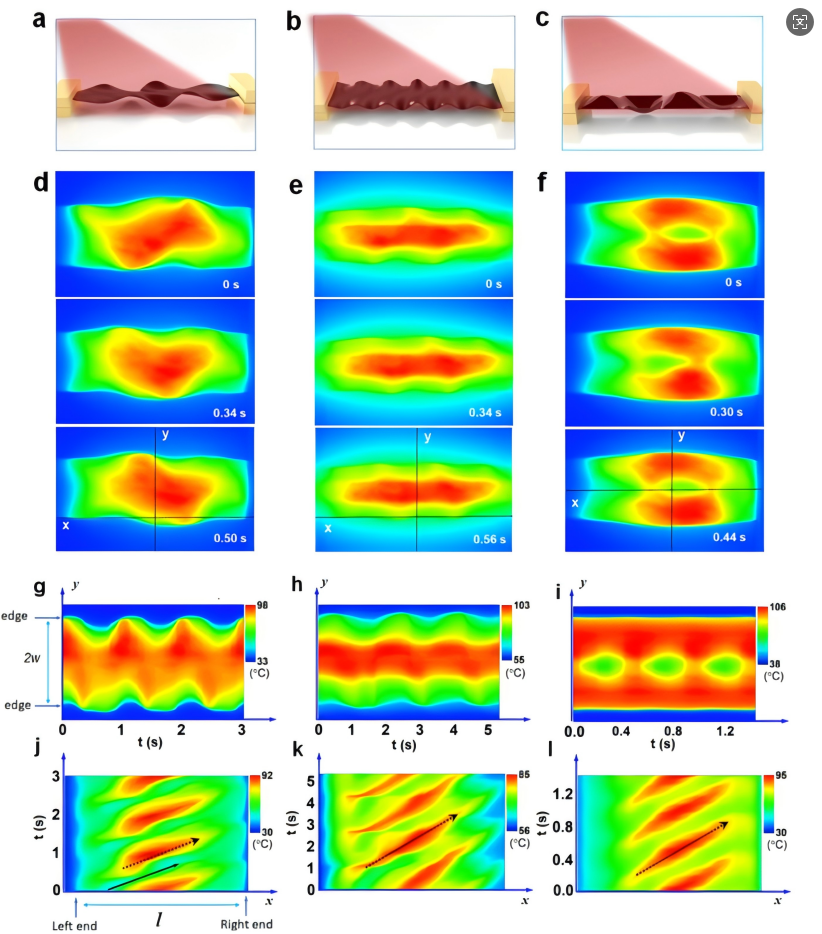 PRTAS的波动并非由传统电机驱动,而是基于光-热-机械耦合效应:结构化光照引发MSAM局部选择性加热(通过光热转换),导致材料的热膨胀/收缩差异(受光强分布调控),进而产生非均匀应变场并驱动波动。