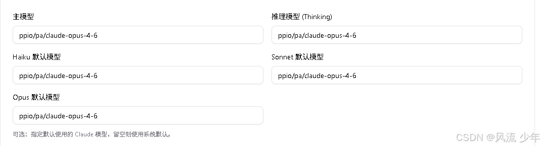 新增模型厂商,主要配置参数:请求地址、API Key、主模型、推理模型 (Thinking)等参数。