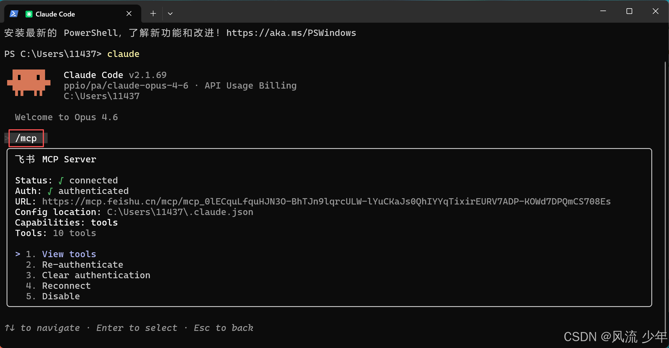 随便使用一个工具,这里以claude为例,输入/mcp查看mcp列表。