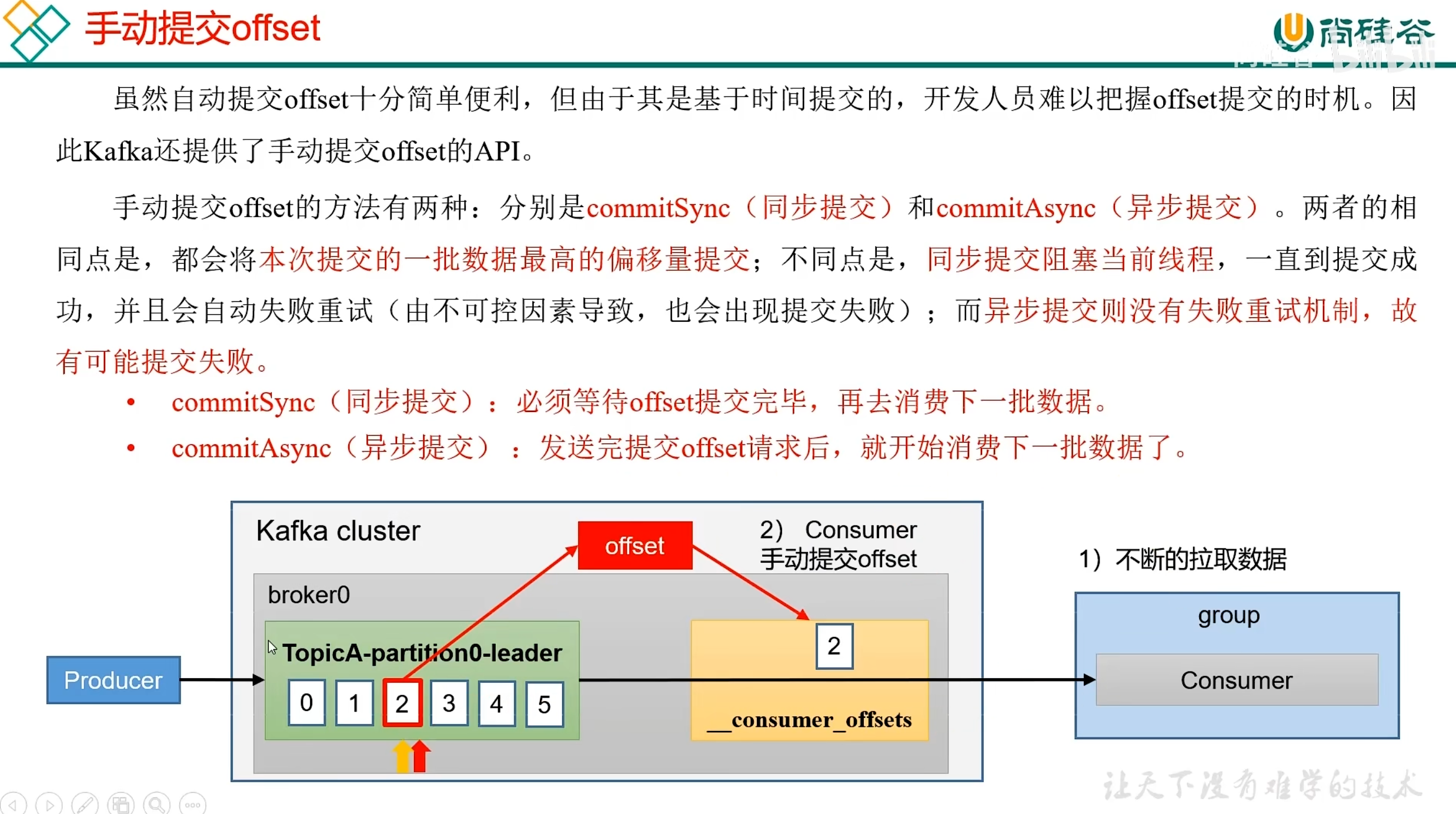 手动提交让开发者可以在确认消息处理完成后再提交 Offset,从而避免这些问题。