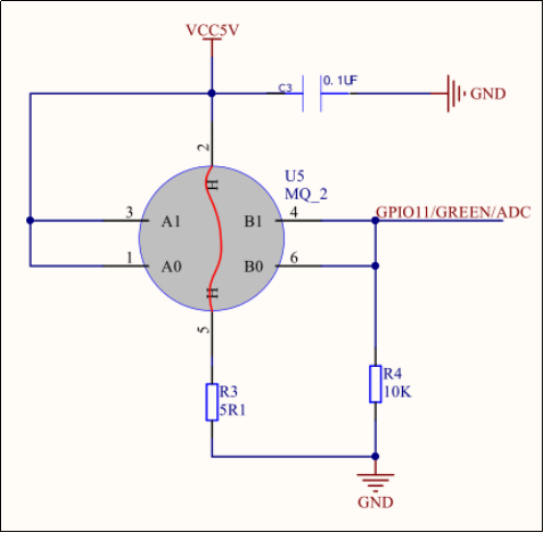 MQ-2 气体传感器所使用的气敏材料是在清洁空气中导电率较低的二氧化锡(SnO2)。当传感器所处环境中存在可燃气体时,传感器的电导率随空气中可燃气体浓度的增加而增大。