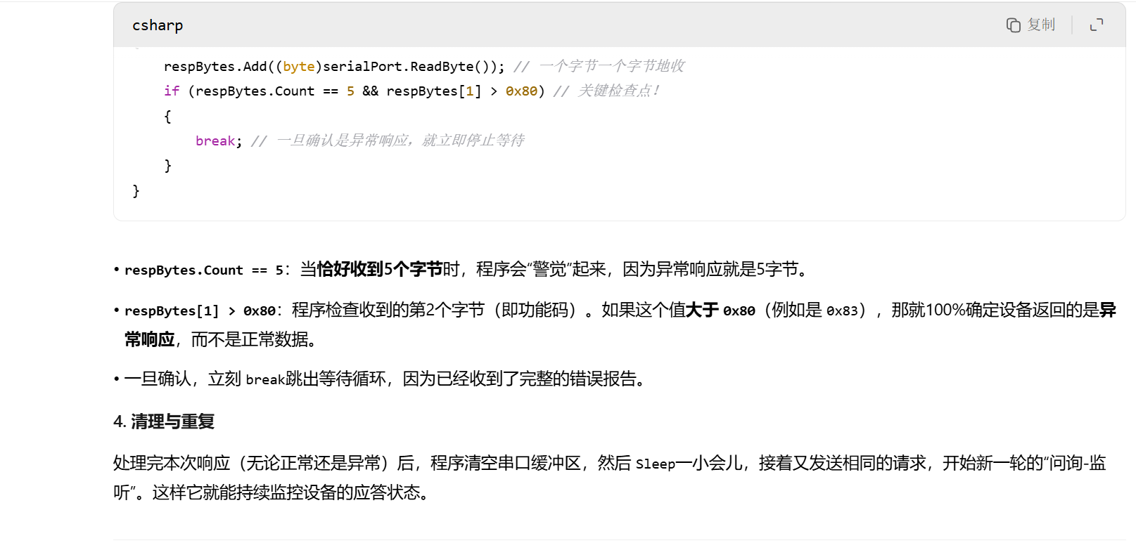 //respBytes[1] > 0x80:检查第2个字节(功能码)是否大于 0x80