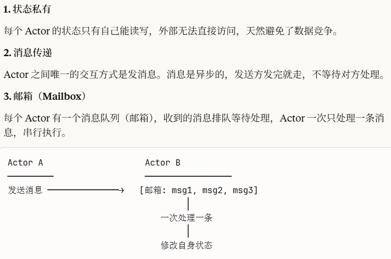 Actor 模型是一种并发编程模型,核心思想:用"Actor"作为并发的基本单元,Actor 之间不共享任何状态,只通过发送消息来通信