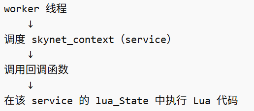 Skynet 管理的调度单元是 service,对于 Lua 类型的 service,其内部包含一个独立的 lua_State 作为执行环境。每个 service 在同一时刻只会被一个 worker 线程执行,不同 service 之间可以在多个 worker 线程上并行调度