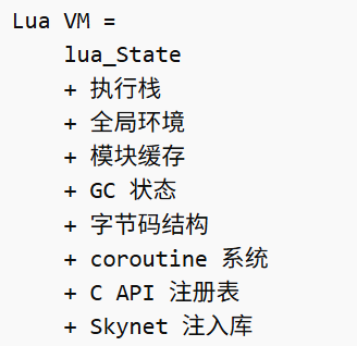 Lua VM 同时负责管理执行状态、运行栈、函数调用、协程和垃圾回收等机制