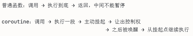 coroutine 是一种可以在执行过程中主动挂起、并在之后从挂起点恢复执行的函数