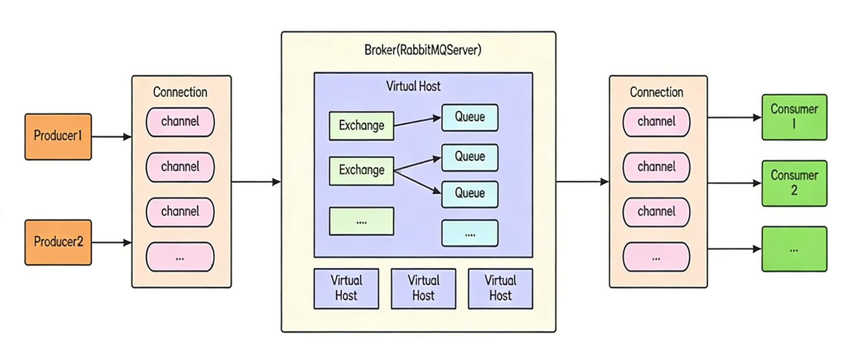 虚拟主机,为消息队列提供了一个逻辑上的隔离机制,对于 RabbitMQ 而言,一个 BrokerServer上可以存放多个 Virtual host ,当多个不同的用户 使用同一个 RabbitMQ 时,就可以划分出多个 虚拟主机,每个用户在自己的 虚拟主机创建 exchange 和 queue;