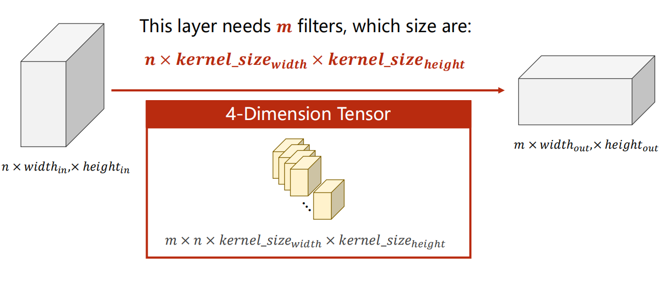 图中明确指出,该层需要 m m m 个滤波器,每个滤波器的尺寸是 n × k e r n e l _ s i z e w i d t h × k e r n e l _ s i z e h e i g h t n \times kernel\size{width} \times kernel\size{height} n×kernel_sizewidth×kernel_sizeheight。