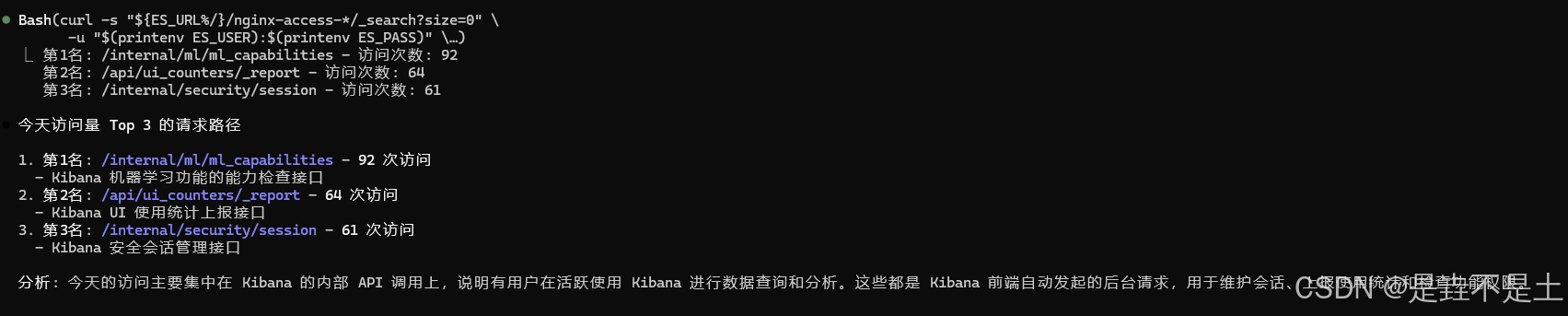 一是Skills调用与联动,通过调用后续编写的Elasticsearch专属Skills,建立与ES的稳定连接,精准获取存储在ES中的nginx访问日志(含请求地址、状态码、访问时间、客户端IP等核心字段);